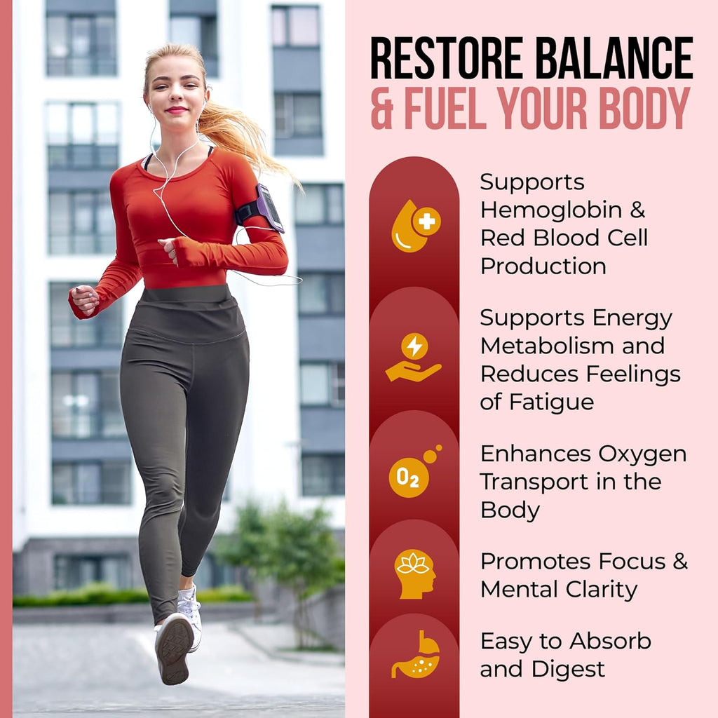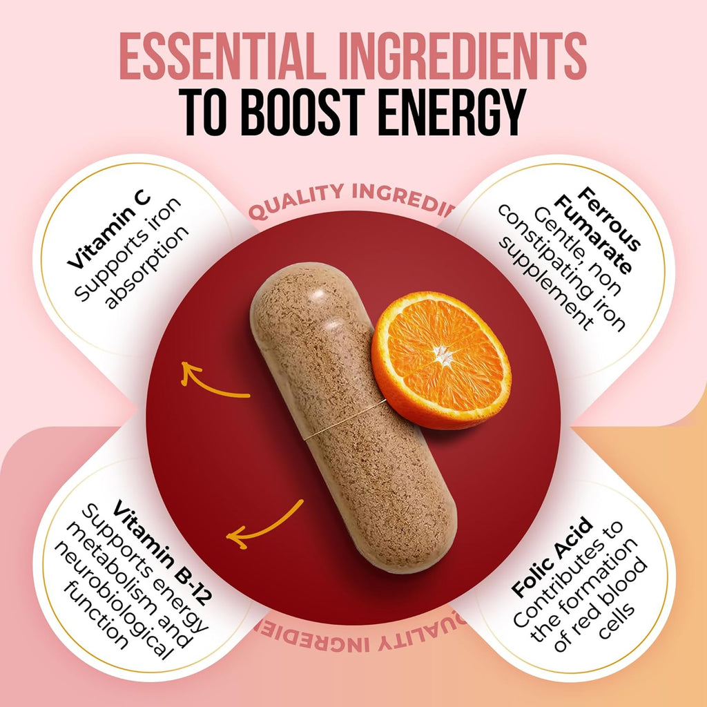 - Scientifically Formulated for Optimal Iron Absorption: Our iron supplement for women and men combines iron, vitamin B-12, folic acid, and vitamin C with gentle ferrous fumarate for enhanced absorption and minimal digestive discomfort