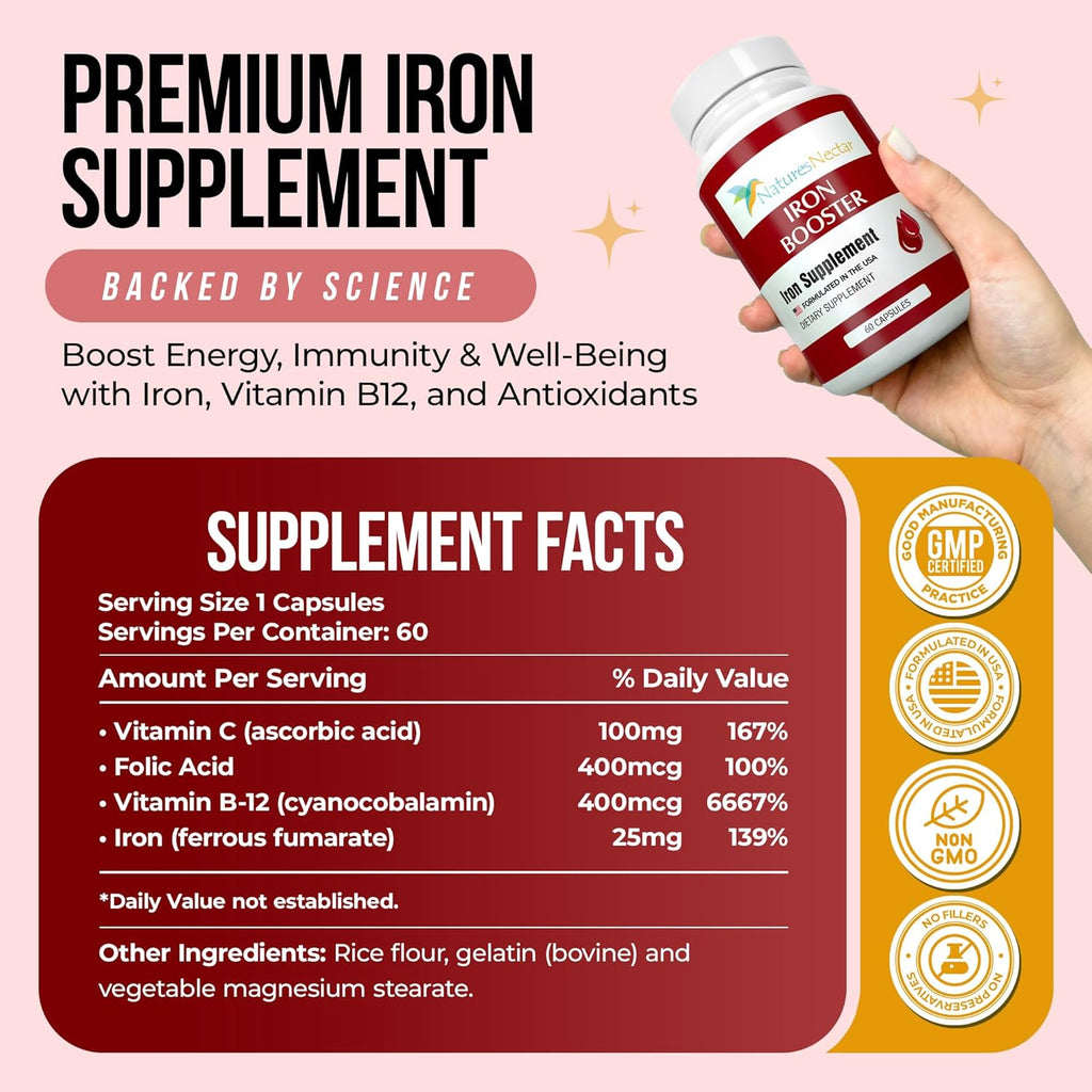 Nature's Nectar Blood Builder Iron Supplement for Men & Women – Slow Release Non-Constipating Iron Capsules with Vitamin B-12, Folic Acid & Vitamin C – Supports Red Blood Cell Production 60 Capsules